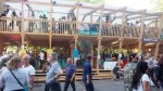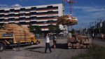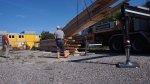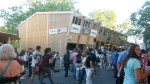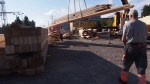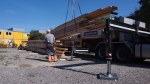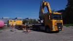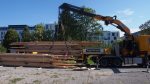 Pünktlich um 09.30 war er da: Der Sattelschlepper mit dem ersten Teil unseres Holzpavillons. Gekommen ist er von der Badenfahrt, wo der Pavillon bereits zehntausende von Besucher/innen erfreut hat. Streng nach dem Motto der Wunderkammer „Es gibt keinen Abfall, ausser man wirft etwas weg“ haben dessen Schöpfer, die 2×2 Architekten, der eleganten Holzkonstruktion zu neuem Leben verholfen, indem sie der Wunderkammer das Gebäude für Ateliers, Werkstätten und Vereinslokale vermacht haben. Den Transport ermöglicht hat Hugelshofer Elektro, ebenfalls aus dem Aargau.