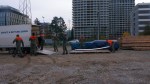 Nun bauen wir wieder! Es scheint eine Regel zu sein, dass die Wunderkammer nur baut, wenn’s kalt und nass ist; beim Container letztes Jahr war es jedenfalls ebenso. Die Position des Pavillons mussten wir leider wegen des Elektrokastens verschieben, sodass das ganze auf dem Areal gelagerte Holz verschoben werden musste. Zum Glück haben wir so gute Nachbarn; der Gabelstapler der Firma Eberhard von der Baustelle nebenan half uns bei der schwierigen Aufgabe. Und an der Front dabei natürlich wieder unser Vorstandsmitglied Christian!