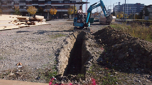 Kaum war das Feld frei, kamen der Bagger und die BaggerführerInnen an: Amanda, Andrea und Andi baggerten wohl die geradesten und schönsten Kanäle des Kantons. Denn unser Pavillon braucht Füsse, um fest in der Wunderkammer zu stehen – keine schlechte Idee bei so viel TräumerInnen und Träumen!