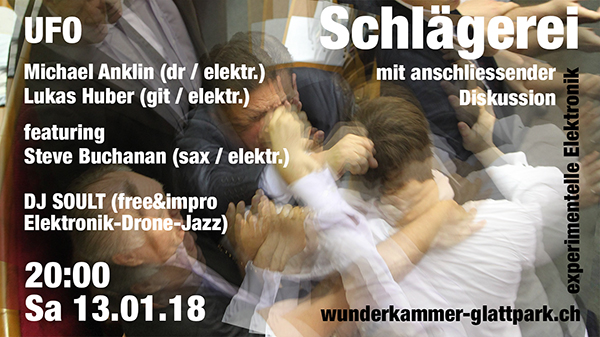 Am Samstag steigen UFO, Basels bester Instrumental-Elektronik Impro-Export, wieder in den Ring, diesmal gegen den gestandenen Genfer Saxophonisten Steve Buchanan. In ihrer Reihe „Schlägerei mit anschliessender Diskussion“ improvisieren Michael Anklin (dr / Elektronik), Lukas Huber (git / Elektronik) und Steve Buchanan (sax, Elektronik) nicht mit- sondern gegeneinander: Es geht darum die Ideen der Gegenspieler im Keim zu ersticken; ein neues musikalisches Vokabular muss ad hoc entwickelt werden. Wer von den Maestros gewinnt, wird sich weisen, jedenfalls wird es blutig – elektroakustisches Herzblut in Strömen!