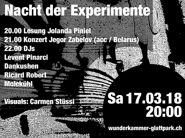 Und wieder eine Nacht der Experimente: Am Samstag besucht uns Yegor Zabelov, der wohl innovativste weissrussische Akkordeon-Spieler, Komponist und Autor von Film- und Theatermusik. Es liegt darum nahe, eine Zürcher Experimental-Filmfrau miteinzuladen: Carmen Stüssi. Ihre düsteren und poetischen Visuals begleiten das wehmütige und romantische Set Zabelovs (und nachher unsere DJs); der schwarze Zürcher Mond trifft auf die grosse östliche Seele. Vorgängig liesst Jolanda Piniel aus ihrem Werk kurze skurile Texte zum lachen, nachdenken und staunen.