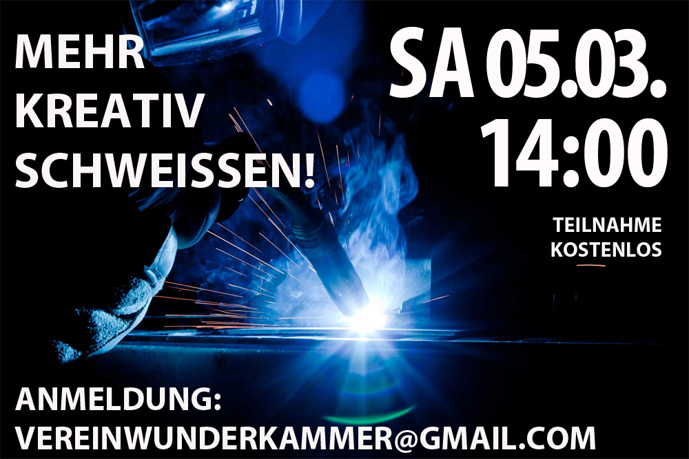 Wegen grosser Nachfrage gibt’s einen zusätzlichen Termin fürs Kreativschweissen am Sa 05.03. Melde dich also schnell an! Die Teilnahme ist kostenlos.