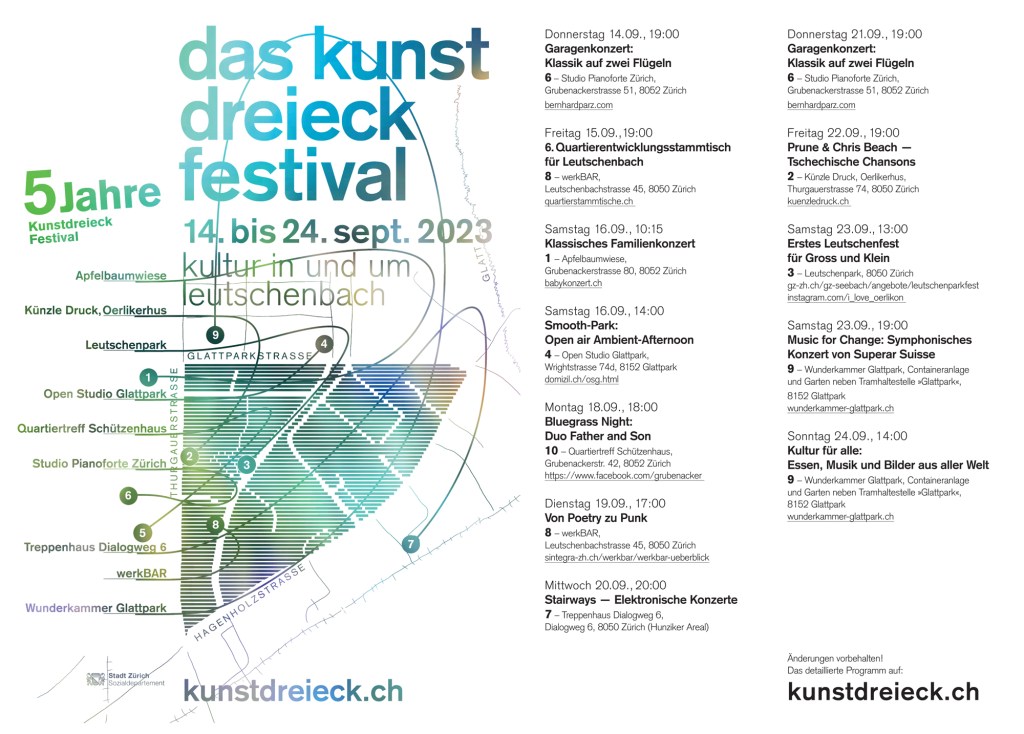Das Kunstdreieck Festival ist in vollem Gange und ein wunderbares Konzert jagt das andere, heute findet dasjenige der tschechischen Liedermacher in der Künzle Druckerei statt. Morgen Samstag kommt mit dem Symphoniekonzert der jungen Leute von Superar Suisse ein Highligh auf uns zu: Junge Menschen von 12 bis 20 vertonen im Birkengarten mit grossem Können klassische Werke der grossen Komponisten. Folgendes Programm ist vorgesehen: