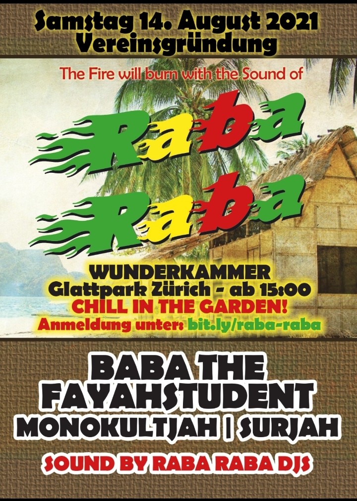 Und wieder wird Neues geboren in der Wunderkammer! Der Verein Raba Raba wird gegründet und wird künftig mit Reggae, Ragga, Raggamuffin, Dancehall und anderen Delikatessen unsere Ohren verwöhnen. Drum: Meet the artists und komm nächsten Samstag 14.08. ab 15:00 in den Birkengarten zum grillen und chillen, während die Raba Raba DJs uns den Sound dazu bringen. Und werde Mitglied im neuen Verein!