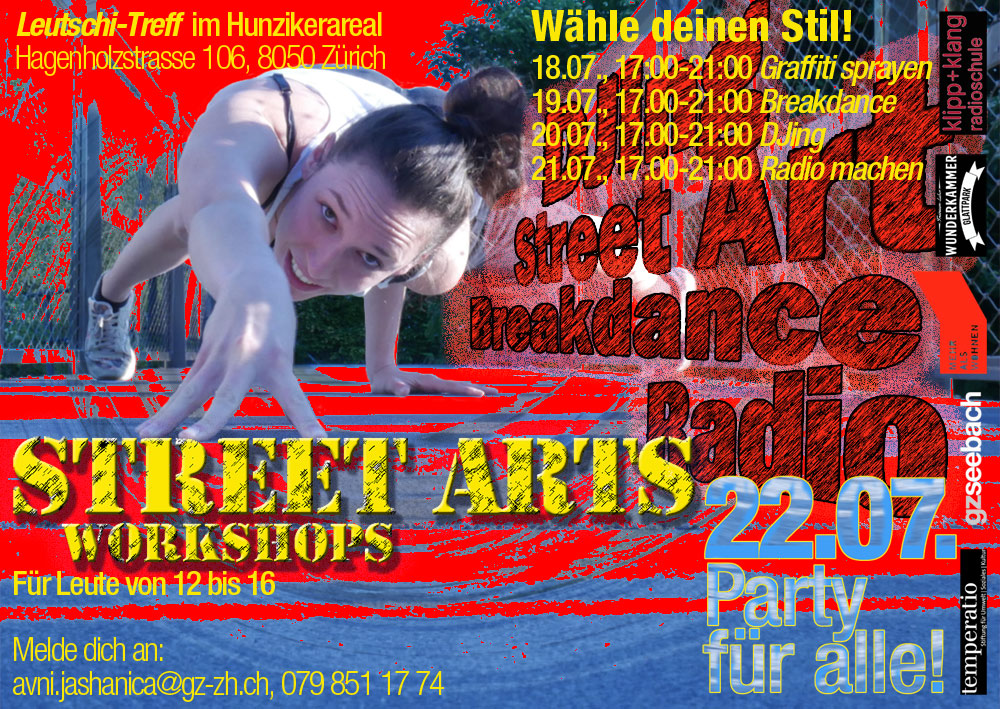 In der ersten Sommerferien-Woche vom 18. bist zum 21. Juli lernen junge Menschen im Leutschi Treff Sprayen, Breakdancen, DJing und/oder Radio machen. In vier Workshops legen wir die Basics, mit denen 12- bis 16-Jährige ihre Kreativität später selbständig weiterentwickeln können. Am 22. Juli findet dann eine Party im Leutschi Treff statt bei der die Jugendlichen das neue Wissen zum Besten geben – und natürlich auch kräftig miteinander feiern!